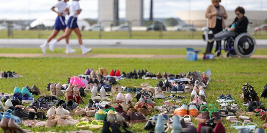Ato na Esplanada do ministérios dispõe vários pares de sapatos de pessoas acometidas pela Encefalomielite Miálgica – Foto: Fabio Rodrigues-Pozzebom/ Agência Brasil