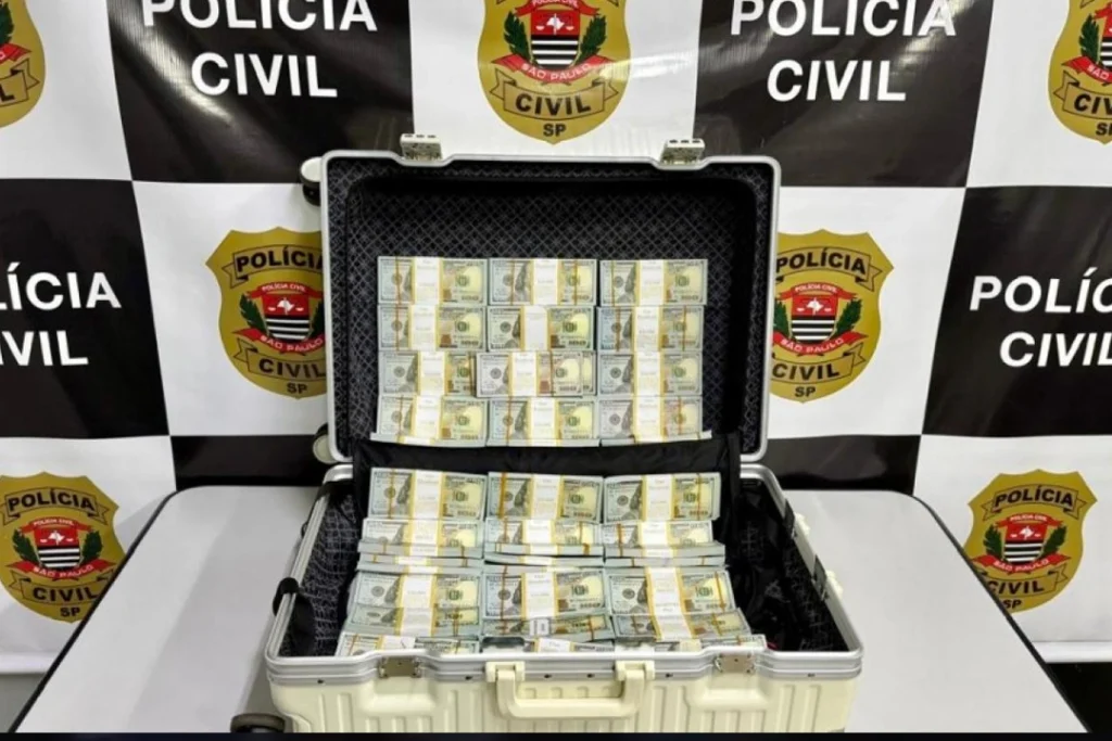 Além do valor utilizado na compra do veículo, a polícia localizou outros dois malotes com a acusada. No total, foram apreendidos 680 mil dólares falsos, evidenciando que a estrutura do crime era voltada para golpes de grande escala.